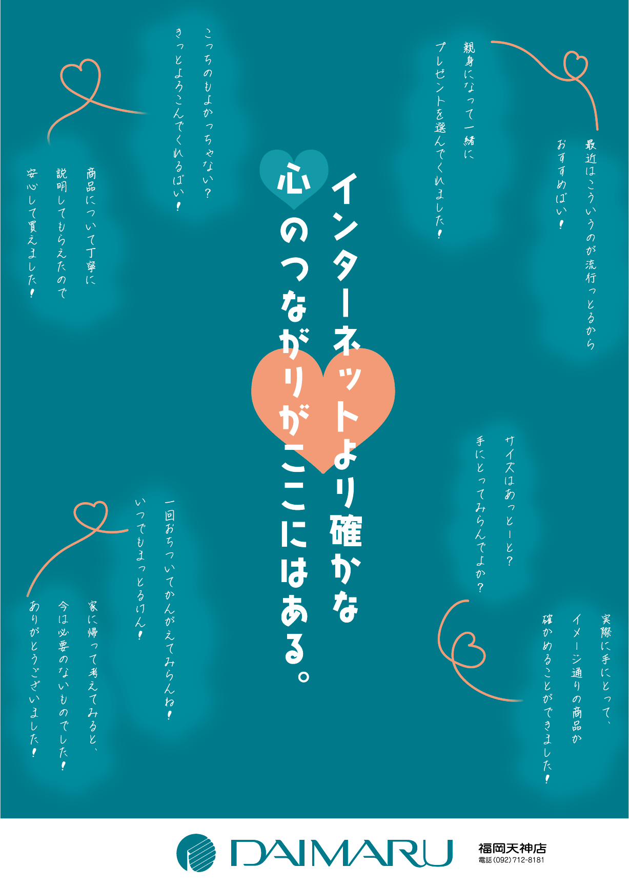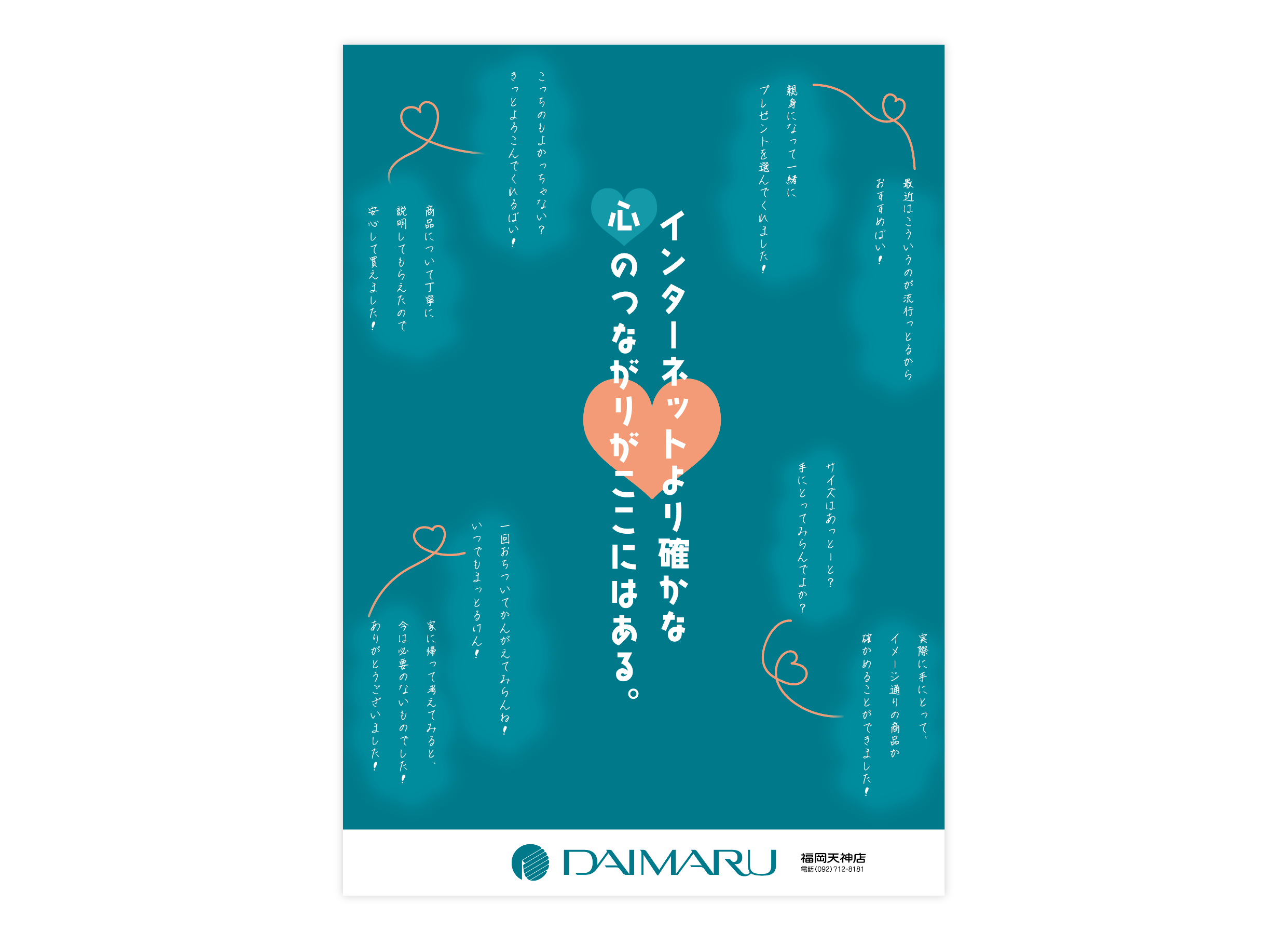 人と人とのつながりを表現してほしいとのお題だったので、インターネット販売では味わえない店員の方との心温まる会話や、実物を実際に見て触れる良さをアピールしようと思いました。
