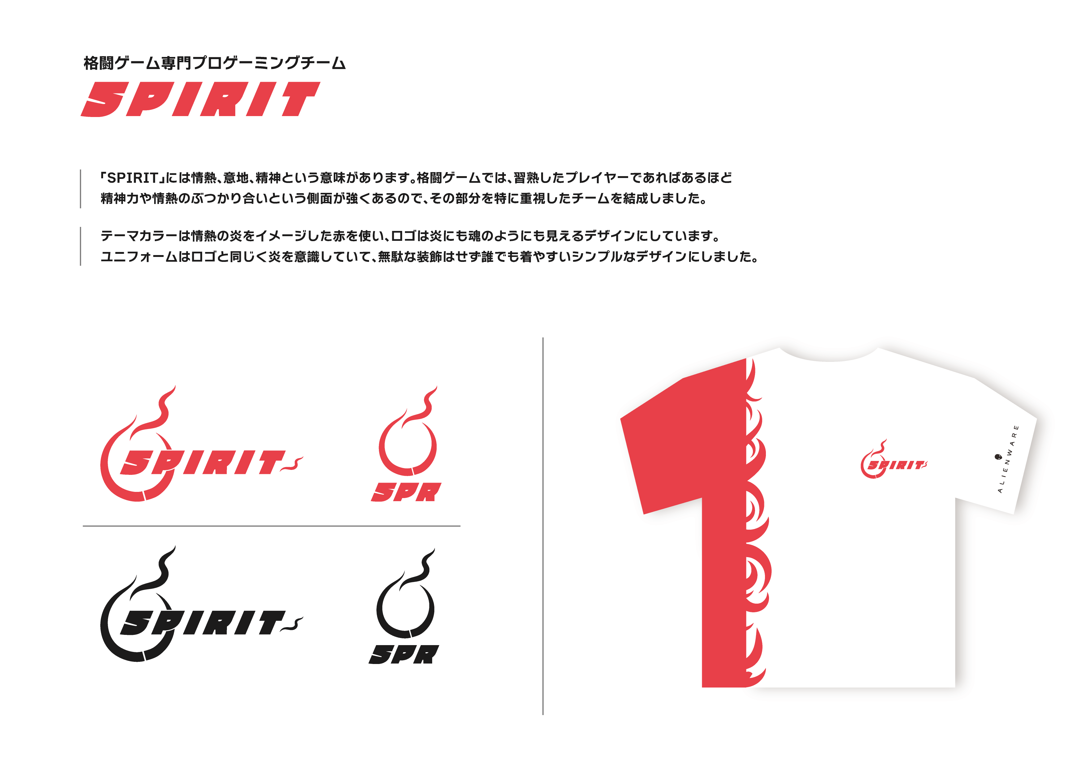 架空の格闘ゲーム専門プロゲーミングチーム「SPIRIT」のユニフォームのデザインを行いました。 ロゴタイプを少し斜めにしたり、炎にきりこみを入れることでスピード感やスタイリッシュ感を出すことを意識しました。 ユニフォームが白が多めになっているのは、e-sportsの会場は薄暗くなっていることが多く、暗くて見えなくならないように全体的に明るくデザインしています。